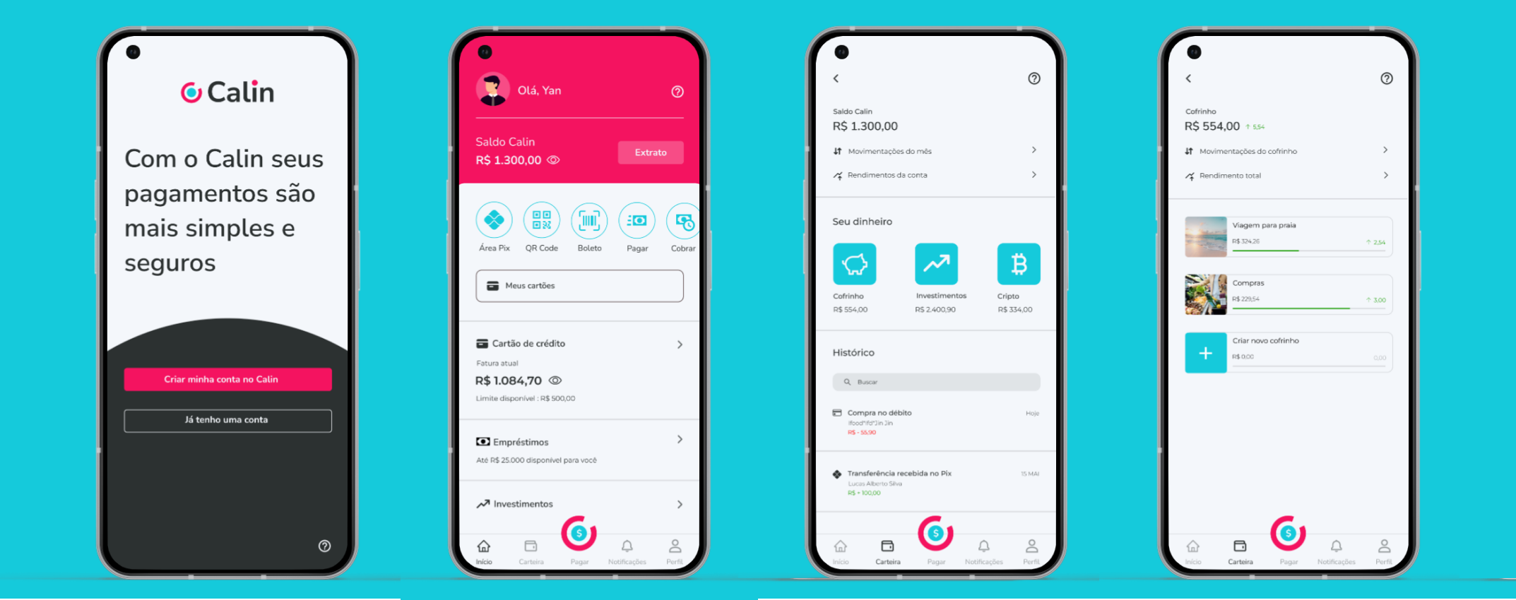 Calin é um aplicativo revolucionário que combina as funcionalidades de uma carteira digital e de um banco, projetado com um único objetivo em mente: simplicidade e facilidade de uso. Com uma interface intuitiva e amigável, o Calin permite que você gerencie suas finanças de forma descomplicada, seja você um usuário iniciante ou experiente.Com o Calin, você pode acessar sua conta bancária, realizar transferências, pagar contas, recarregar seu celular e até mesmo fazer investimentos, tudo em um só lugar. Ele simplifica as transações financeiras do seu dia a dia, permitindo que você faça pagamentos com apenas alguns toques na tela do seu smartphone.