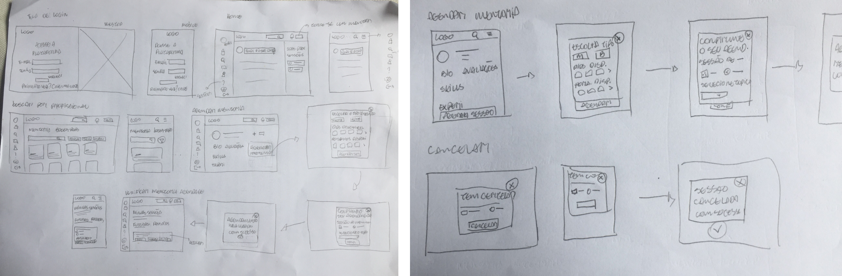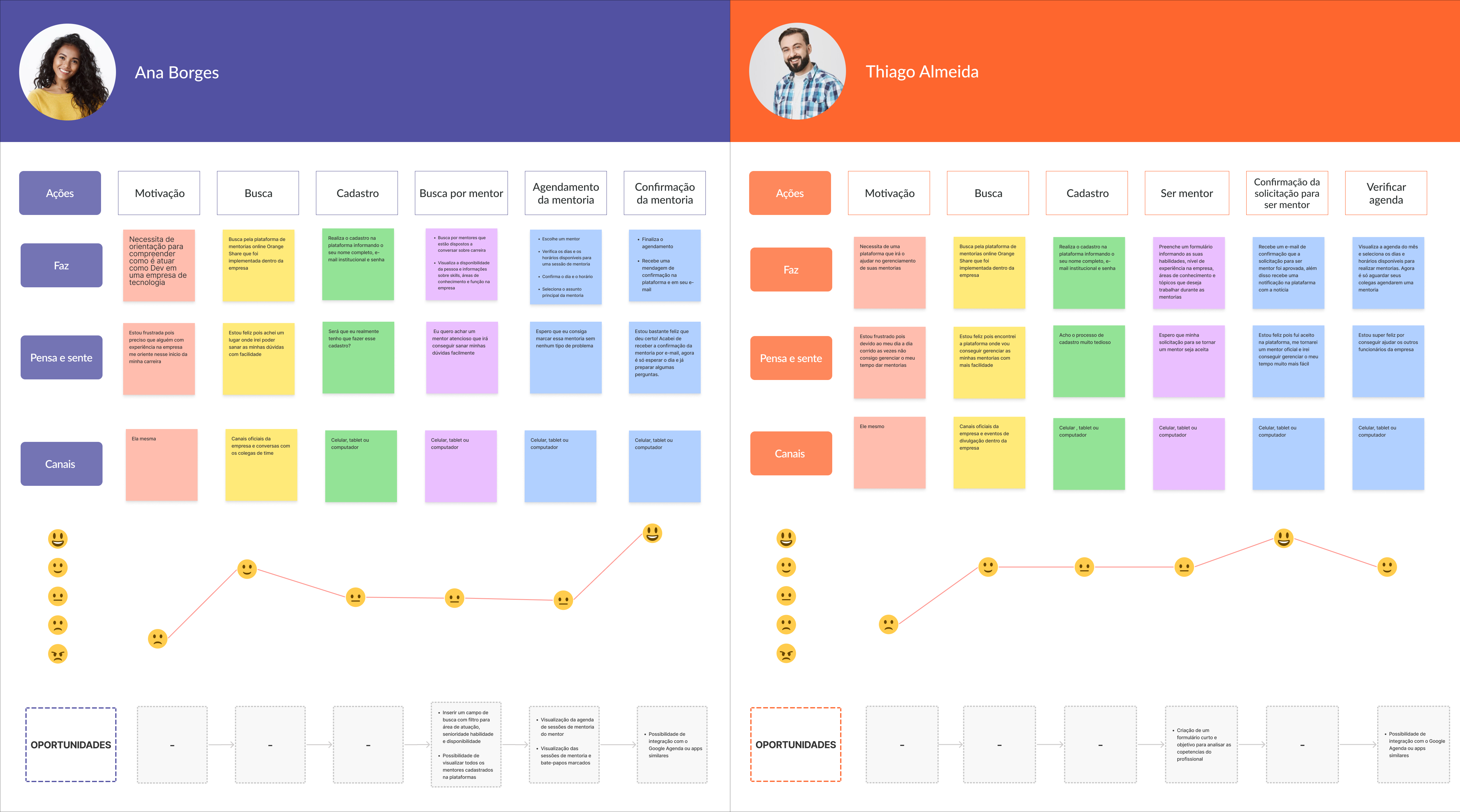 Também com base nas pesquisas, elaboramos dois tipos de jornadas para os dois tipos expecíficos de personas idealizadas antes, a de buscar mentores e agendar mentorias, e a de se cadastrar como mentor e realizar mentorias.