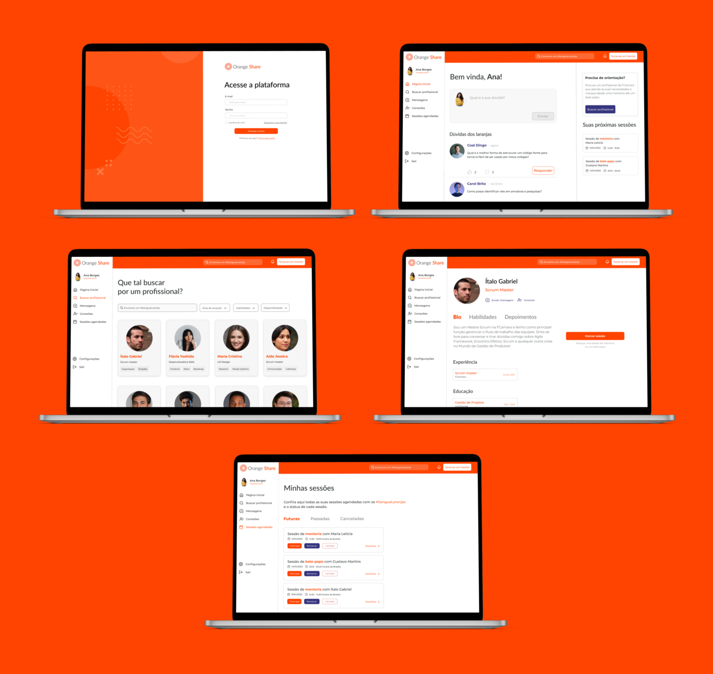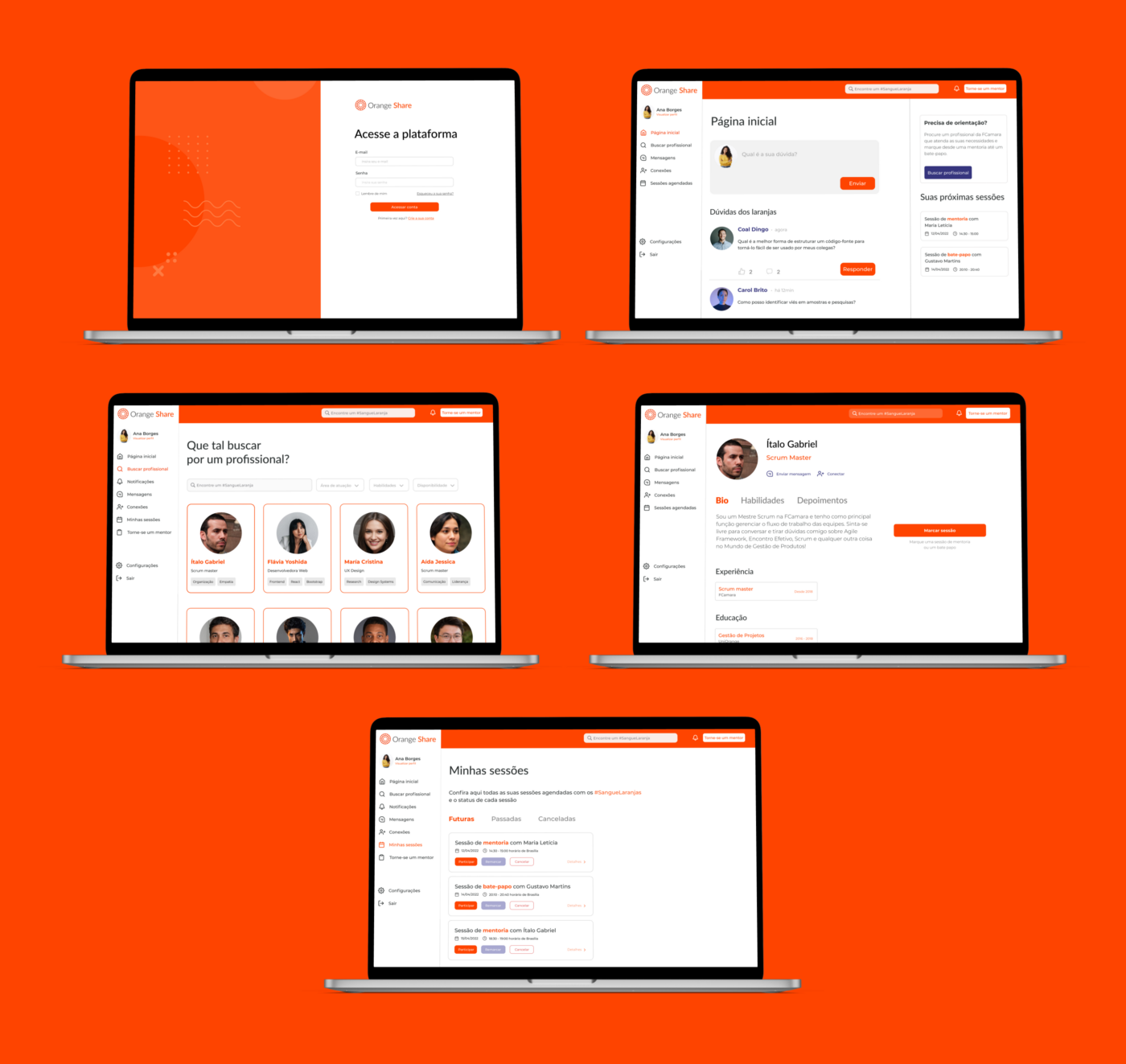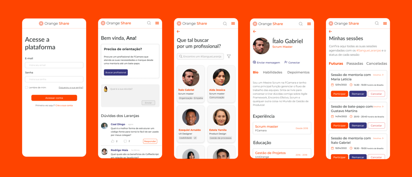 Seguirmos então para a etapa inicial de Prototipação, onde criamos os primeiros protótipos em alta fidelidade da versão Mobile e Dekstop da nossa plataforma Orange Share. Confira abaixo a primeira versão da nossa plataforma :